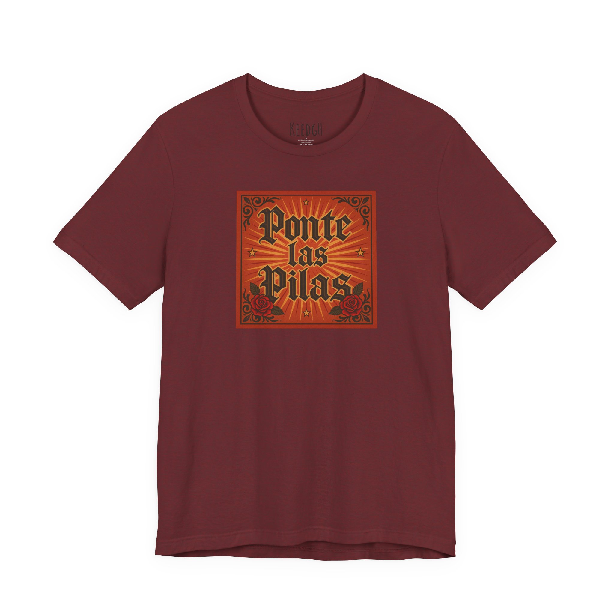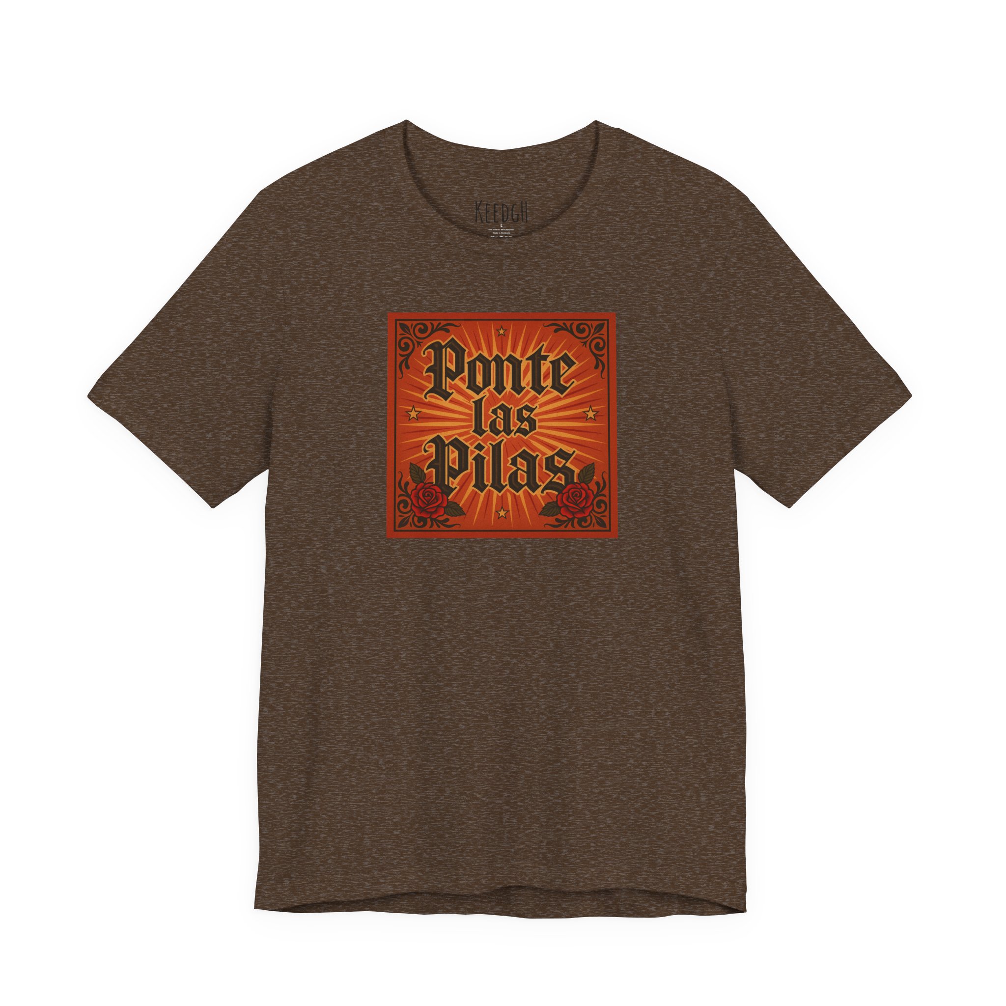This lightweight cotton tee carries a warm, vintage-inspired graphic that reads “Ponte las pilas,” set inside a sunburst frame with ornamental corners. The soft, breathable fabric and retail crew neckline make it easy to wear alone or layered under a jacket. It feels lived-in from the first wear — a shirt that speaks to hustle, heritage, and a spirited, sunlit energy. Wear it on market days, casual meetups, or while running errands around town to add a bold, culturally rooted statement without shouting. The textured brown tone lets the orange-and-red design pop while keeping the overall look grounded and approachable.